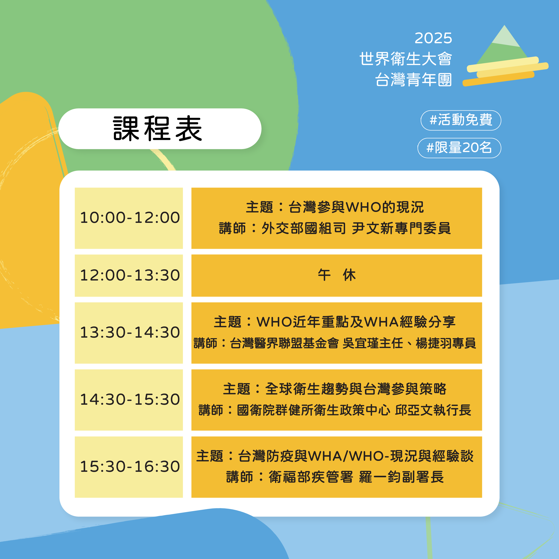 本次特別開放所有同學參與,並邀請到外交部、疾管署以及醫界聯盟的前輩為我們分享關於台灣參與WHO的心路歷程,能夠帶給你更多關於WHO的經驗談與討論交流,同時還能結識更多志同道合的夥伴們!