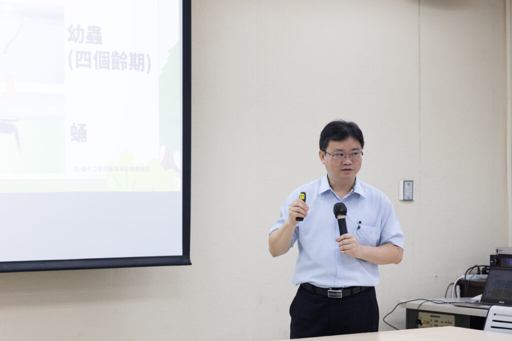 「環境健康工作坊」由台大環境與職業健康科學研究所蔡坤憲教授主講。教授介紹白線斑蚊、埃及斑蚊等病媒蚊的生態、棲息環境及其在登革熱等疾病傳播中的角色,並透過案例解析,說明病媒防治背後的政策與社區行動。