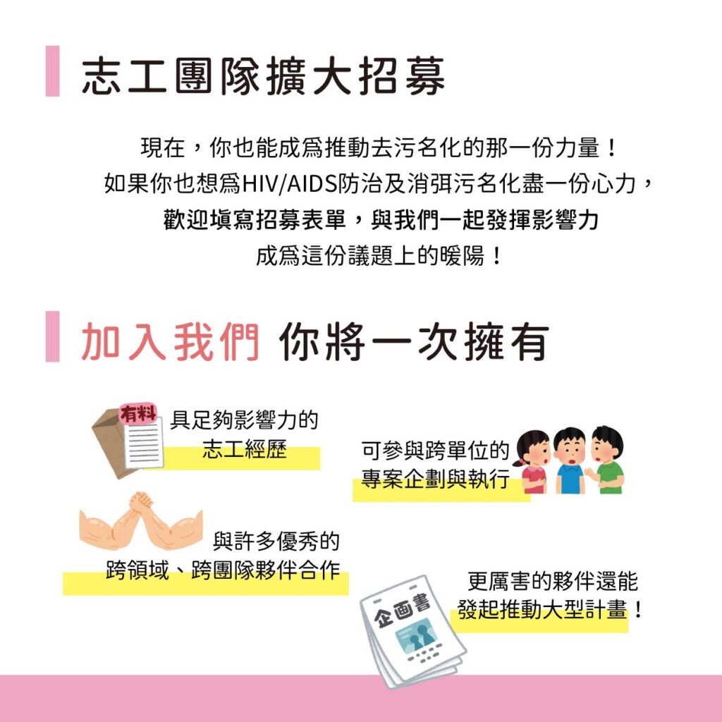 如果您也想為HIV/AIDS的推廣、防治及消弭汙名化盡一份心力,歡迎填寫本招募表單,與我們一起發揮影響力,成為這份議題上的暖陽🌞