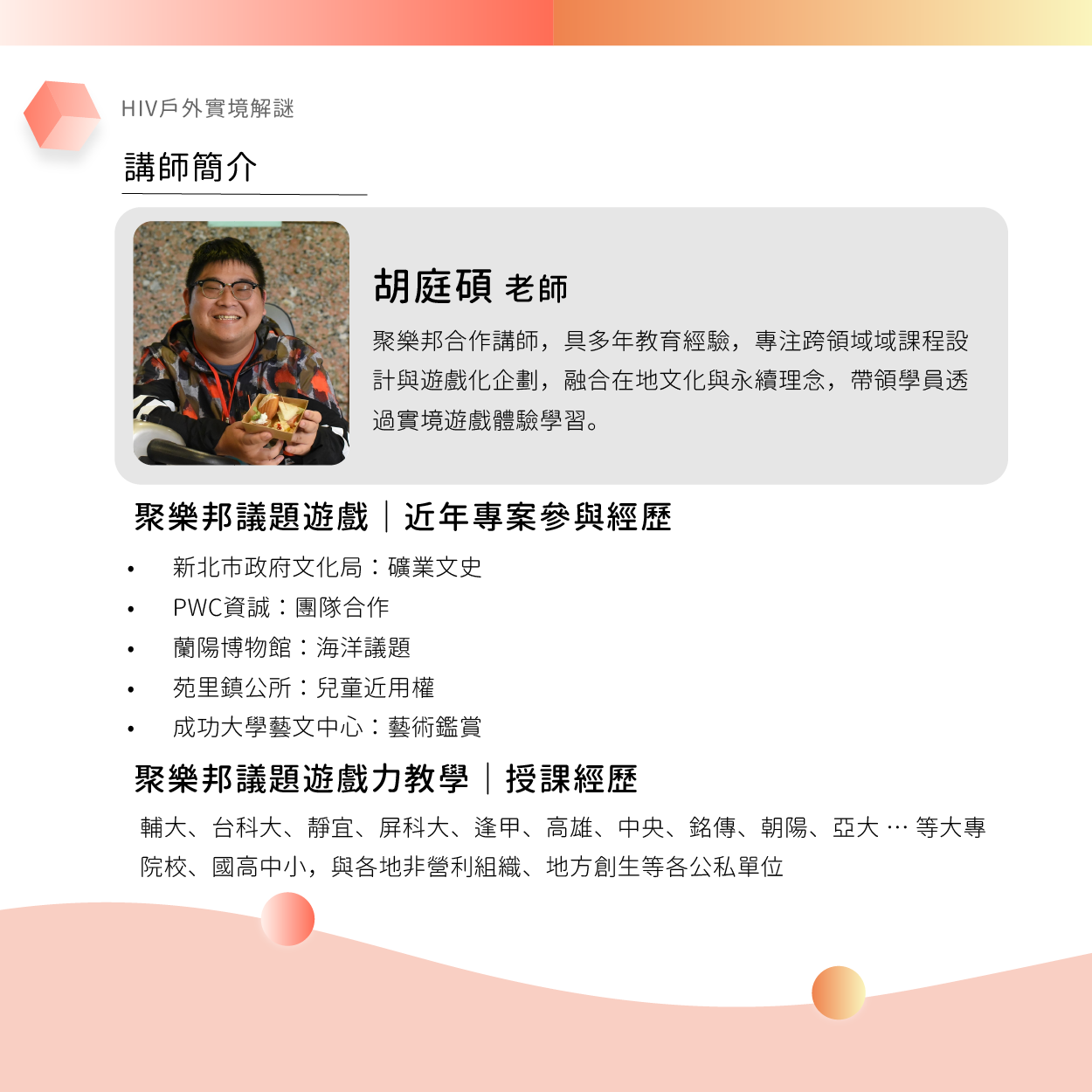 聚樂邦合作講師,具多年教育經驗,專注跨領域域課程設計與遊戲化企劃,融合在地文化與永續理念,帶領學員透過實境遊戲體驗學習。