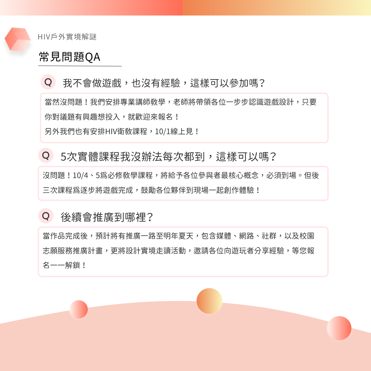 A:當然沒問題!我們安排專業講師教學,老師將帶領各位一步步認識遊戲設計,只要你對議題有興趣想投入,就歡迎來報名!另外我們也有安排HIV衛教課程,10/1線上見!