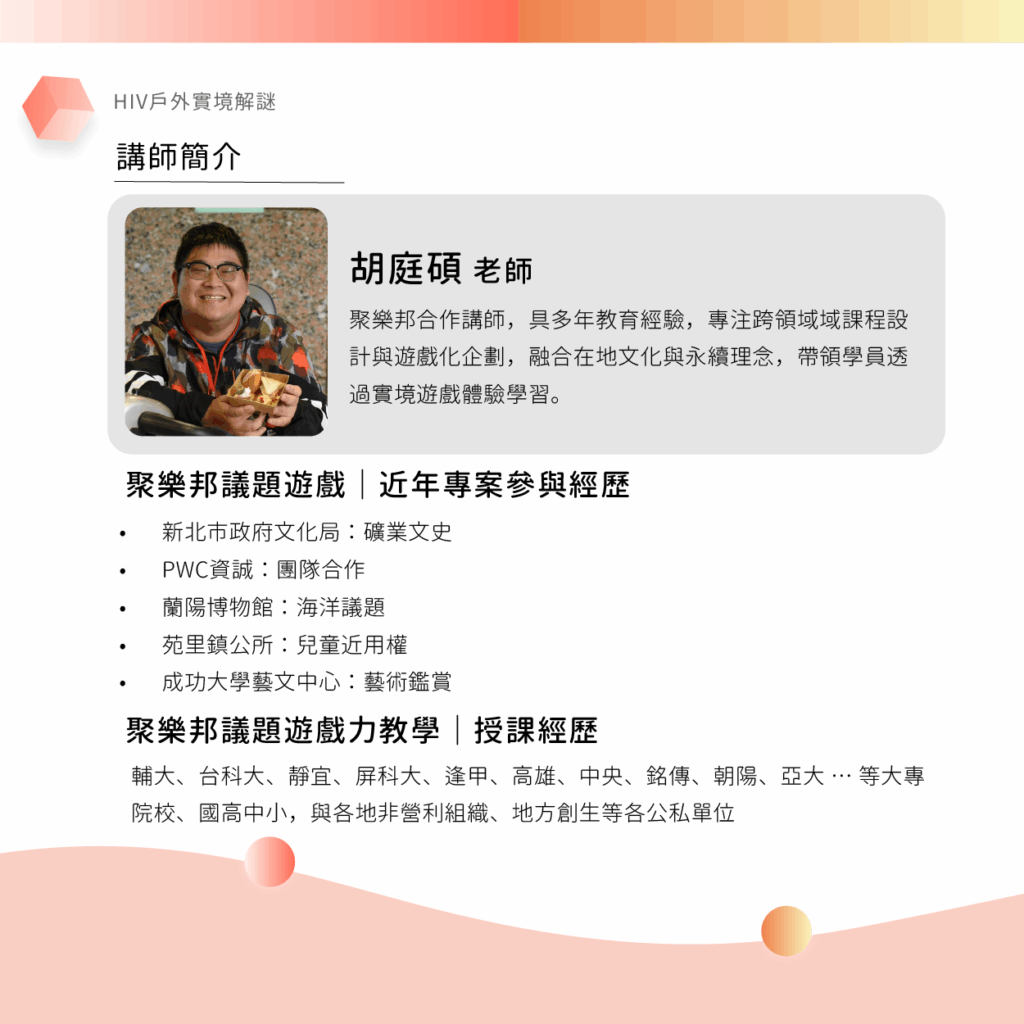 聚樂邦合作講師,具多年教育經驗,專注跨領域域課程設計與遊戲化企劃,融合在地文化與永續理念,帶領學員透過實境遊戲體驗學習。