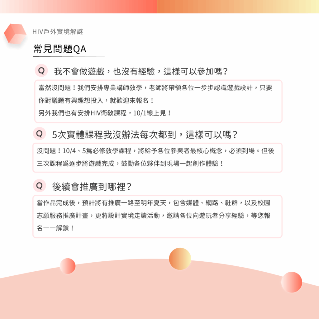 A:當然沒問題!我們安排專業講師教學,老師將帶領各位一步步認識遊戲設計,只要你對議題有興趣想投入,就歡迎來報名!另外我們也有安排HIV衛教課程,10/1線上見!
